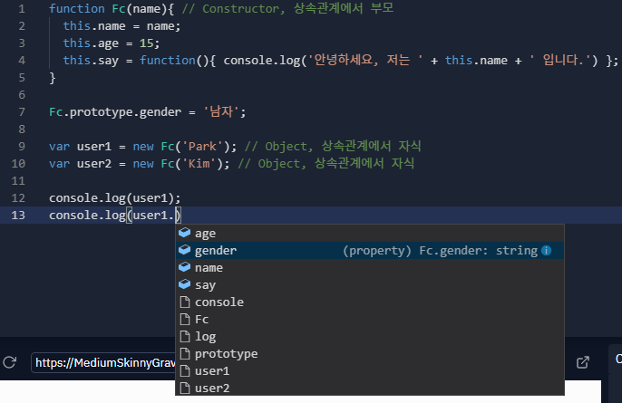 위 코드에서 user1을 호출하면 Prototype으로 선언한 gender 값은 나타나지 않지만 user1.gender 라는 방식으로 gender가 존재함을 알 수 있고, 그 값이 선언한 값으로 저장된 것을 확인할 수 있습니다.